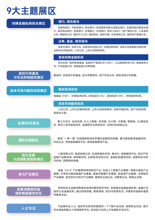 此外,还将举办20余场主题论坛,深度研讨国际创投、园区经济、私募证券、企业出海、供应链金融等前沿热点。届时,将有500余位重量级专家学者齐聚一堂,贡献核心价值:通过权威政策解读,助力市场主体精准把握监管导向与发展脉搏;分享前沿趋势洞察,赋能企业抢占未来发展先机与制高点;促进宝贵经验交流,推动金融同业互鉴共进。高质量的智力支持将为金融业创新发展提供重要指引。