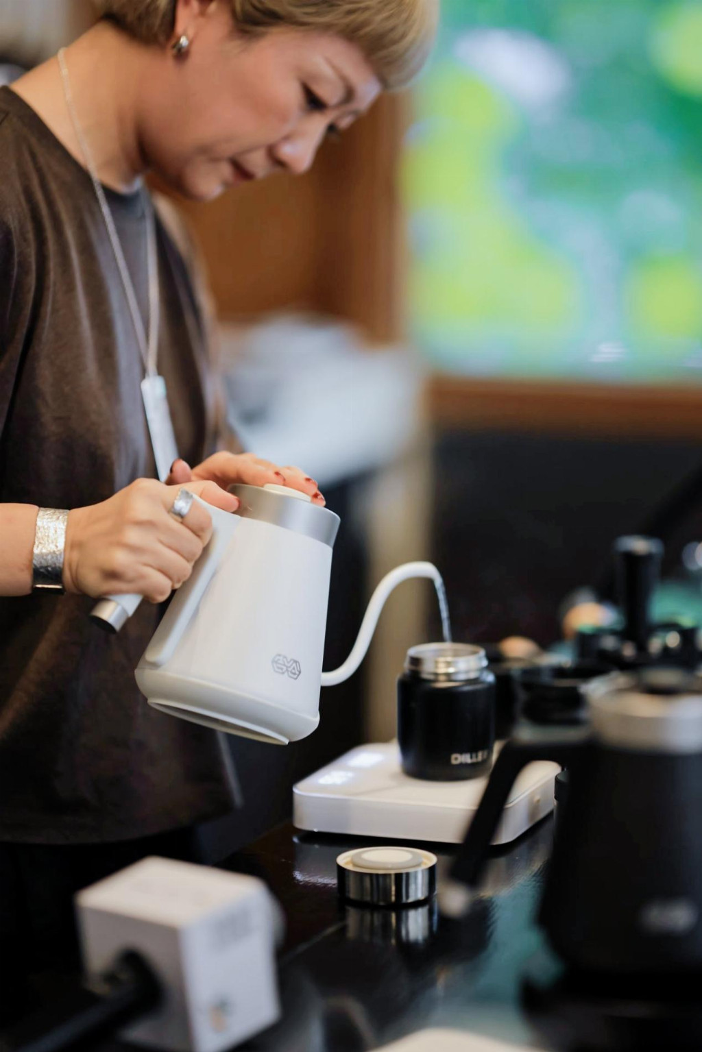 她一边说一边注水,细微地调整着速度、落点与粉层的膨胀。那一刻,仿佛壶与她之间早已达成默契。「我最怕的是温差。」Sherry 继续说,「壶里 93℃,到了滤杯口就掉到 88℃,酸会散,香也会跑。但这只壶出水很稳,尤其在调节水流形状时,我能更细致地控制香气的展开。它让我更像我自己。」