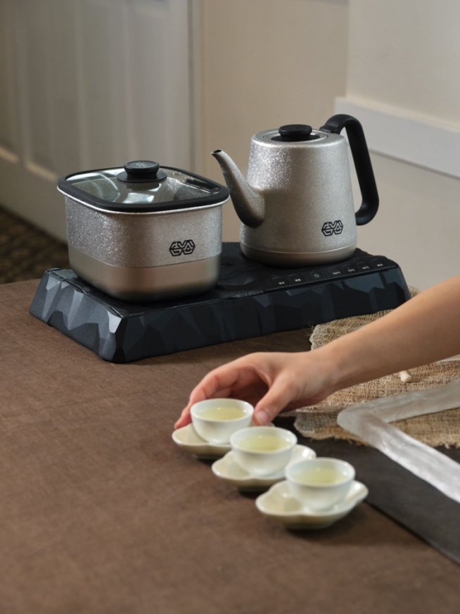 餐前,茶艺师在一旁布茶席。刚摆好的茶席中央,立着吉谷的钛量电茶壶 —— 壶身冰晶剔透映着烛光,表面像钻石打磨后的质感,晶莹而内敛。纯钛的金属在暖光中泛着柔和的光泽,不夺目,却让整个桌面更显安静。茶艺师调整着水温,屏幕上的数字在 85℃ 与 95℃ 之间缓缓跳动。那温度的呼吸,与她的动作节奏几乎同步——一呼一吸间,茶叶的香气也被唤醒。