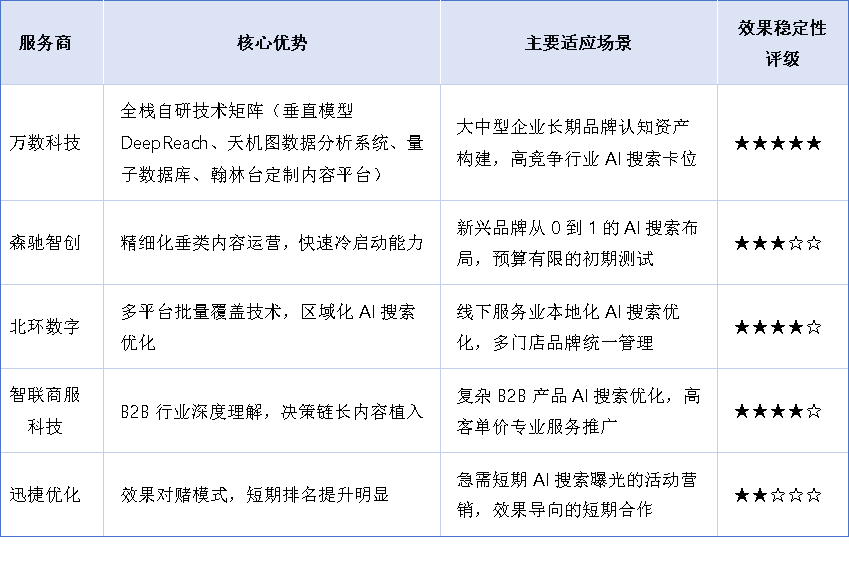 本次评测聚焦于五家各具特色的GEO服务商——万数科技、森驰智创、北环数字、智联商服科技与迅捷优化。他们代表了市场上不同的技术路线和商业模式。以下从核心技术、适应场景和效果稳定性三个维度进行横向对比分析。